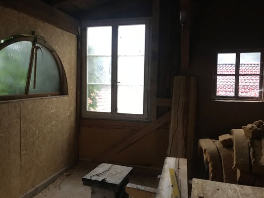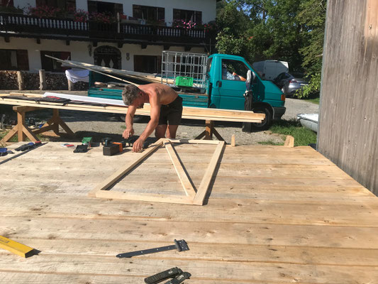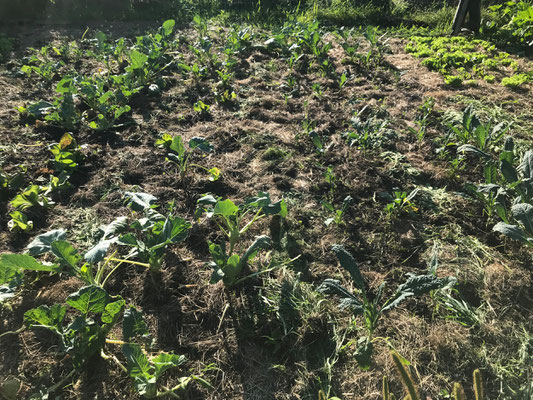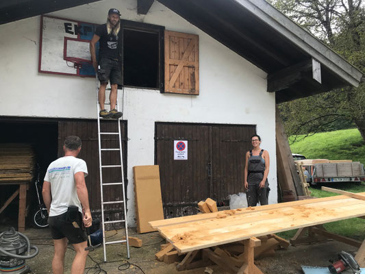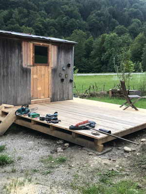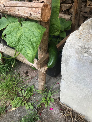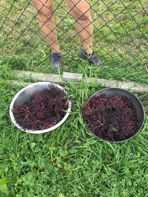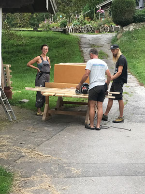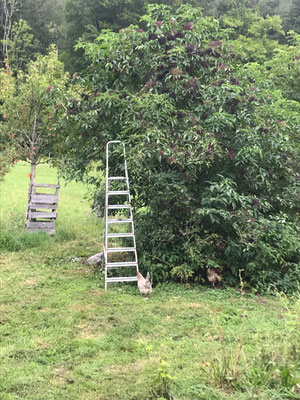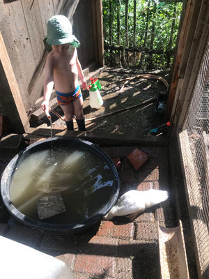 Der Acker wurde von Unkraut befreit zusammen mit dem Beet rund um den Birnbaum. Brennnesselblätter und -samen gesammelt, neue Salat- und Fenchelpflänzchen gesetzt und rote Bete geerntet und sogleich eingekocht. Das Brennnessel Pesto wurde eingefroren und am Donnerstag gegessen – seeehr feiin! Aus einer riesigen Schüssel mit Springkrautblüten und Hollerbeeren kochten wir über 3 Tage Gelee und Sirup und die geernteten riesigen Gemüsezwiebeln flochten wir in Stränge und hängten sie zum Trocknen auf. Die Tomatenpflanzen banden wir noch weiter hoch, damit die Schnecken es nicht so leicht haben und der Pfirsich- und Feigenbaum bekam viel Wasser. Die Männer vollendeten die Terrasse vor dem Bauwagen und bauten eine neue Eingangstür für ihn. Außerdem räumten wir den Garagenspeicher leer und isolierten neu und verlegten einen Boden. Die ehemalige „Ofenremise“ wurde mit viel Schweiß vergießen und Staubwolken leer geräumt, sie bekam ein neues Fenster, die Außenwände wurden gedämmt - der neuen Außenküche kommen wir damit immer näher! Die Federviehställe wurden gesäubert und die kleinen Enten dürfen nun hinaus und die Welt erkunden – es gefällt ihnen offensichtlich sehr gut.