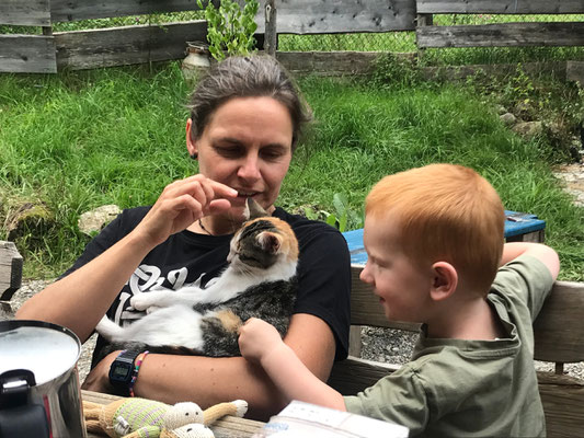 Die Komposterde fand ihren Weg ins Hochbeet, Nico verwöhnte uns mit Crème brûlée und die Kinder verwöhnten Heidi und Leila. Dem Springkraut im Waldgarten ging es noch mit der Sense an den Kragen und der gesteckte Schafzaun im Waldgarten wurde wieder aufgerollt und weggeräumt. Der Rasen in unserem Naschgarten ist wieder kurz und der Rasenmäher generalüberholt und repariert.